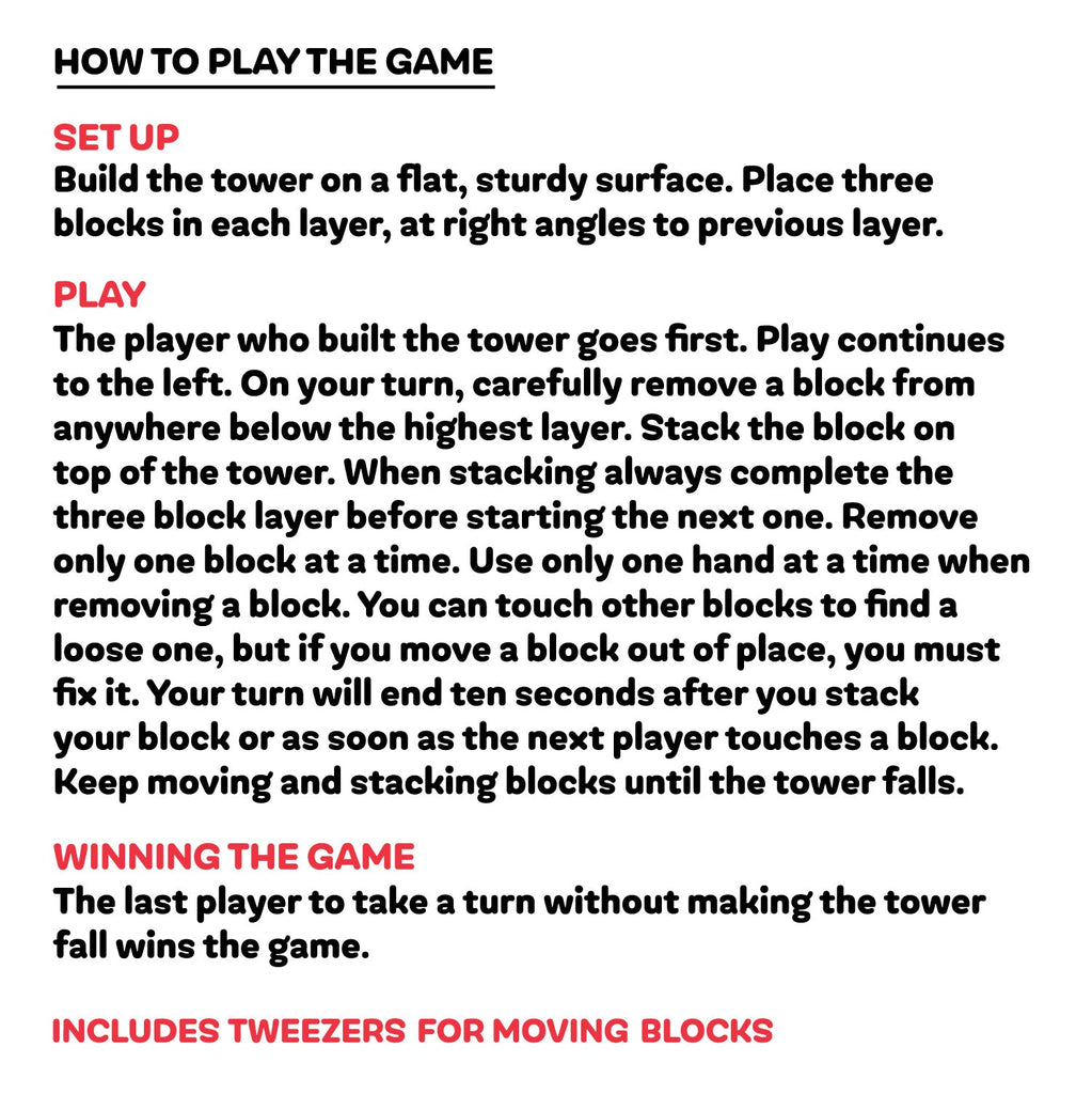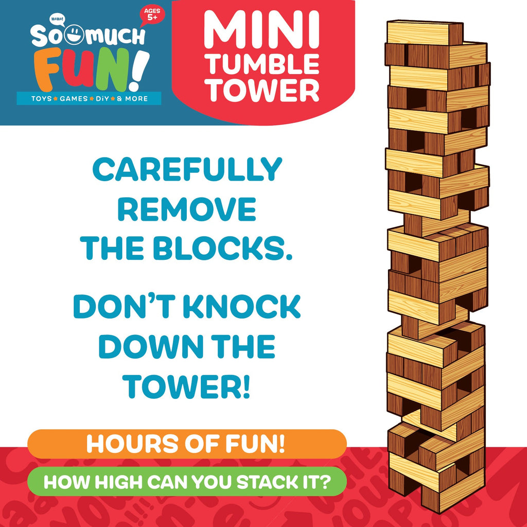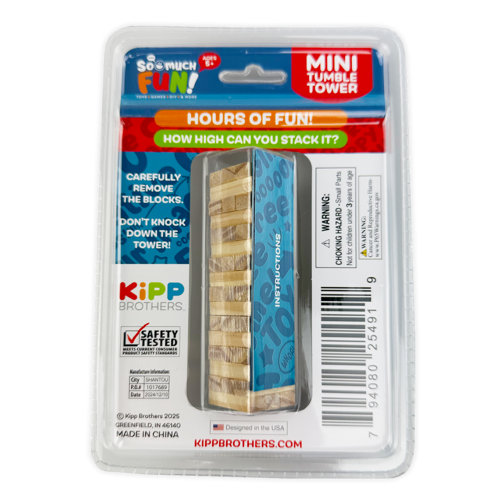 Introducing the Classic Mini Tumble Tower! Have hours of fun carefully removing and stacking the blocks - just don't knock down the tower! With 6 pieces per pack, see how high you can stack it. Includes tweezers for moving blocks. Perfect for family game night or a fun challenge with friends. No display box included – peggable blister pack.