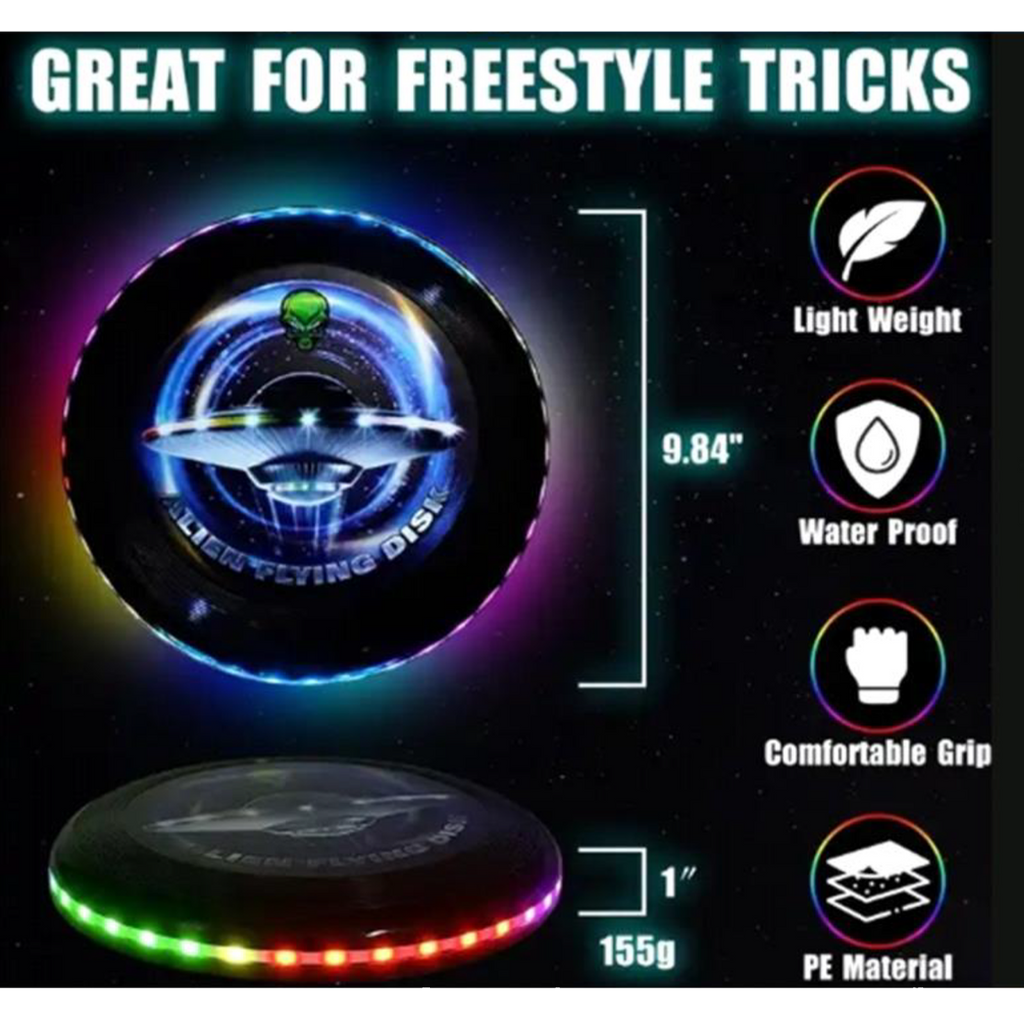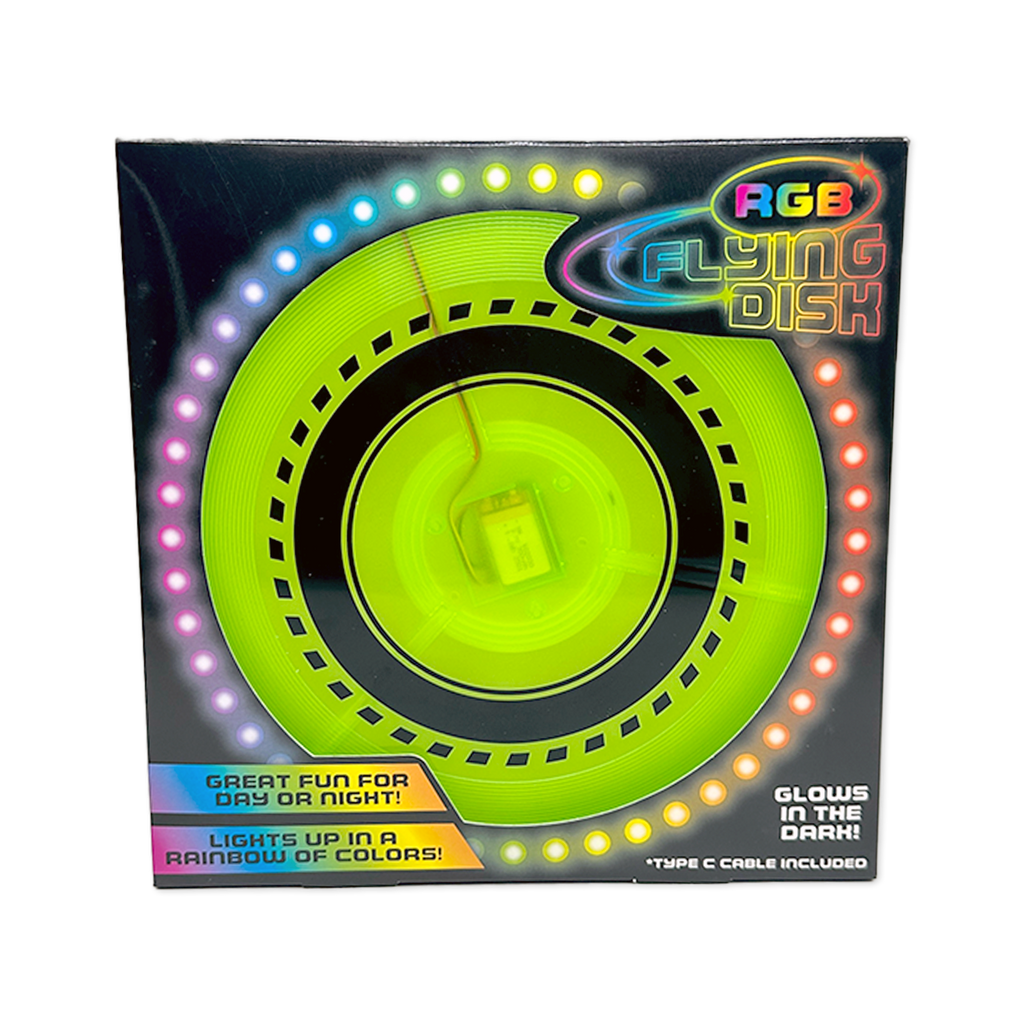 Get ready to fly day or night with our RGB Glow in the Dark Light-up Flying Disc! With 12 lighting modes and a rechargeable battery, this playful disc provides hours of entertainment. Works for 5 hours on a single charge and includes a USB-C charging cable. Fly into the night with this glowing disc!