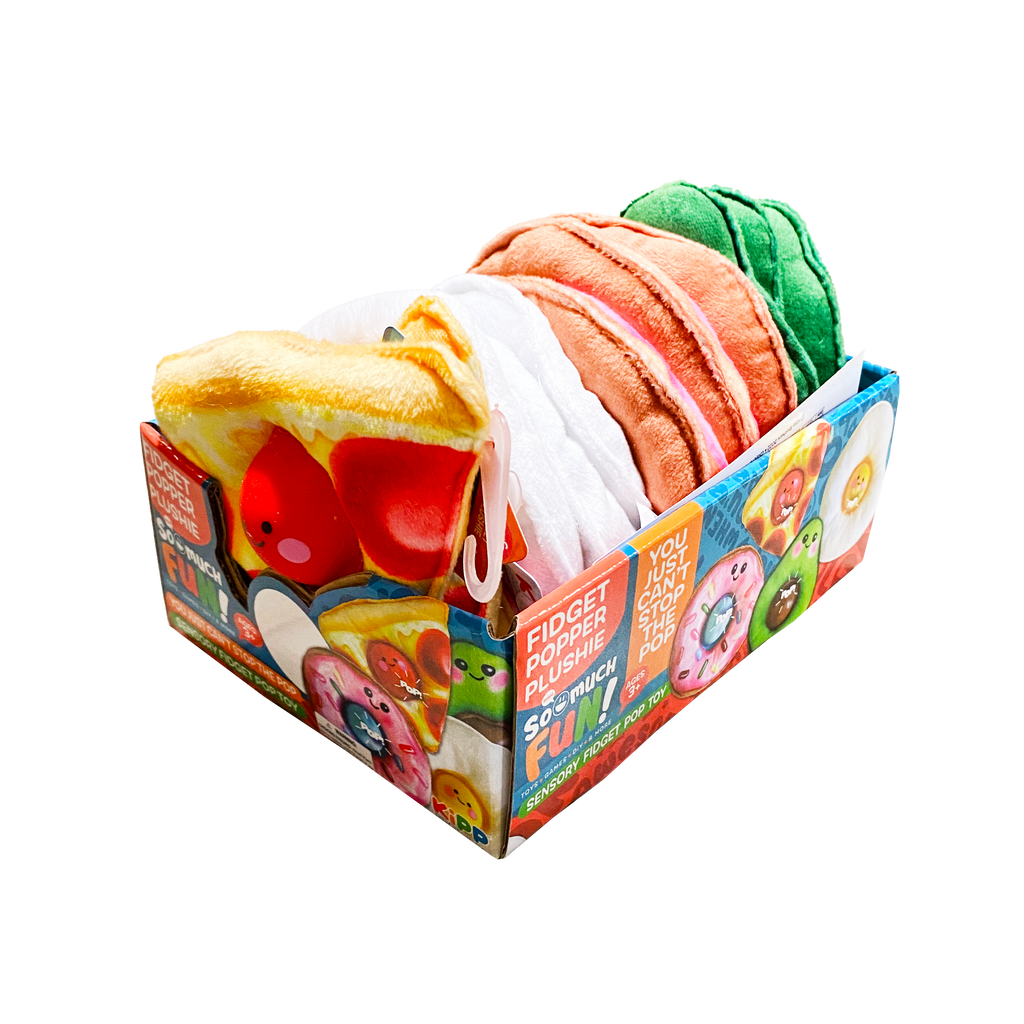 A Kipp Brothers' EXCLUSIVE! 5.5" Fidget Popper Plushies are soft and cute plush with a jumbo pop in the middle. Four assorted styles. Collect them all. 12 plushies in a color display box with toy bin card included for use on the So Much FUN! Toy Bin Program corrugated display or in the clear toy bin pockets. Product fits short or tall bins.
