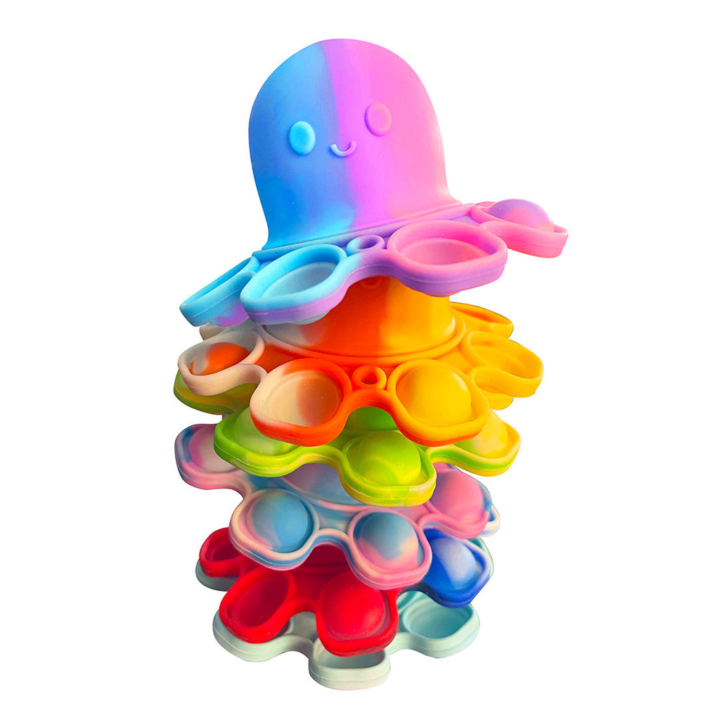 Fidget Fun Pop Octopus is a push pop bubble sensory fidget toy for ages 3+. You just can't stop the pop! Relieves stress. Safety tested. Each 100% silicone octopus is reversible with 1 side a solid color and the other side multi-color marble.